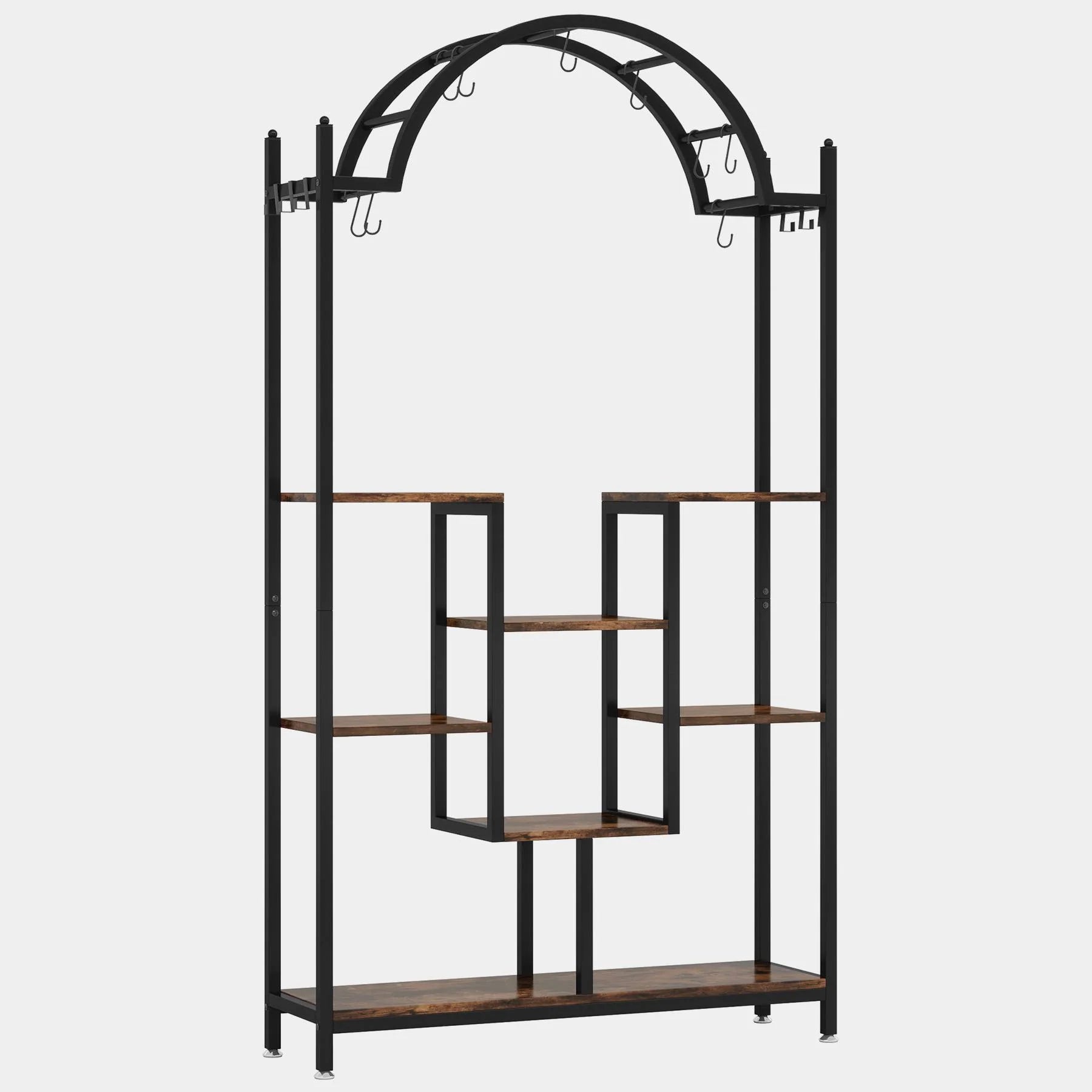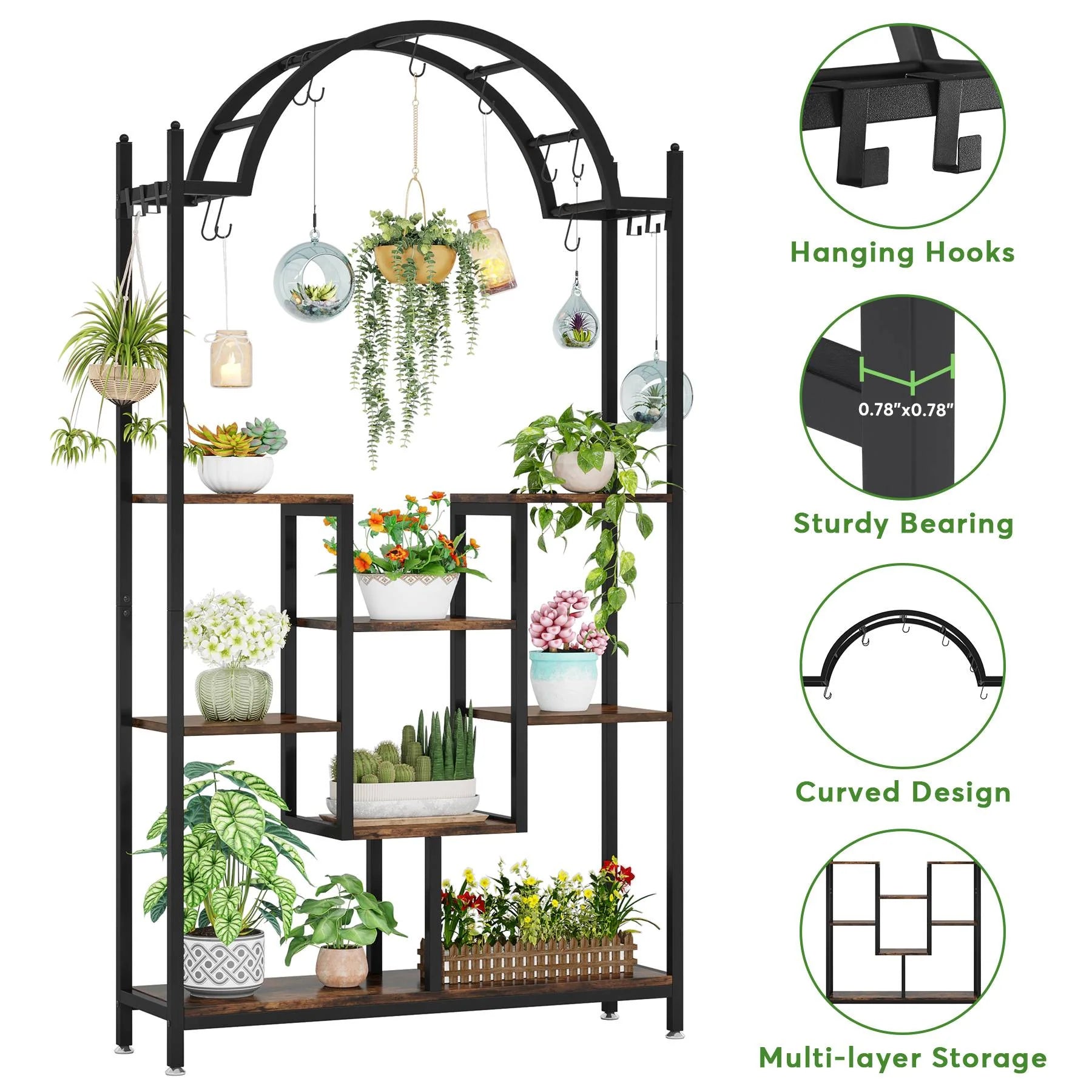 Diseño Arqueado Único – Este soporte para plantas destaca por su diseño en arco con repisas de madera cóncavas, creando un ambiente acogedor para tus plantas. Incluye 6 ganchos cuadrados y 8 ganchos tipo S, ideales para colgar macetas, luces decorativas u otros accesorios.