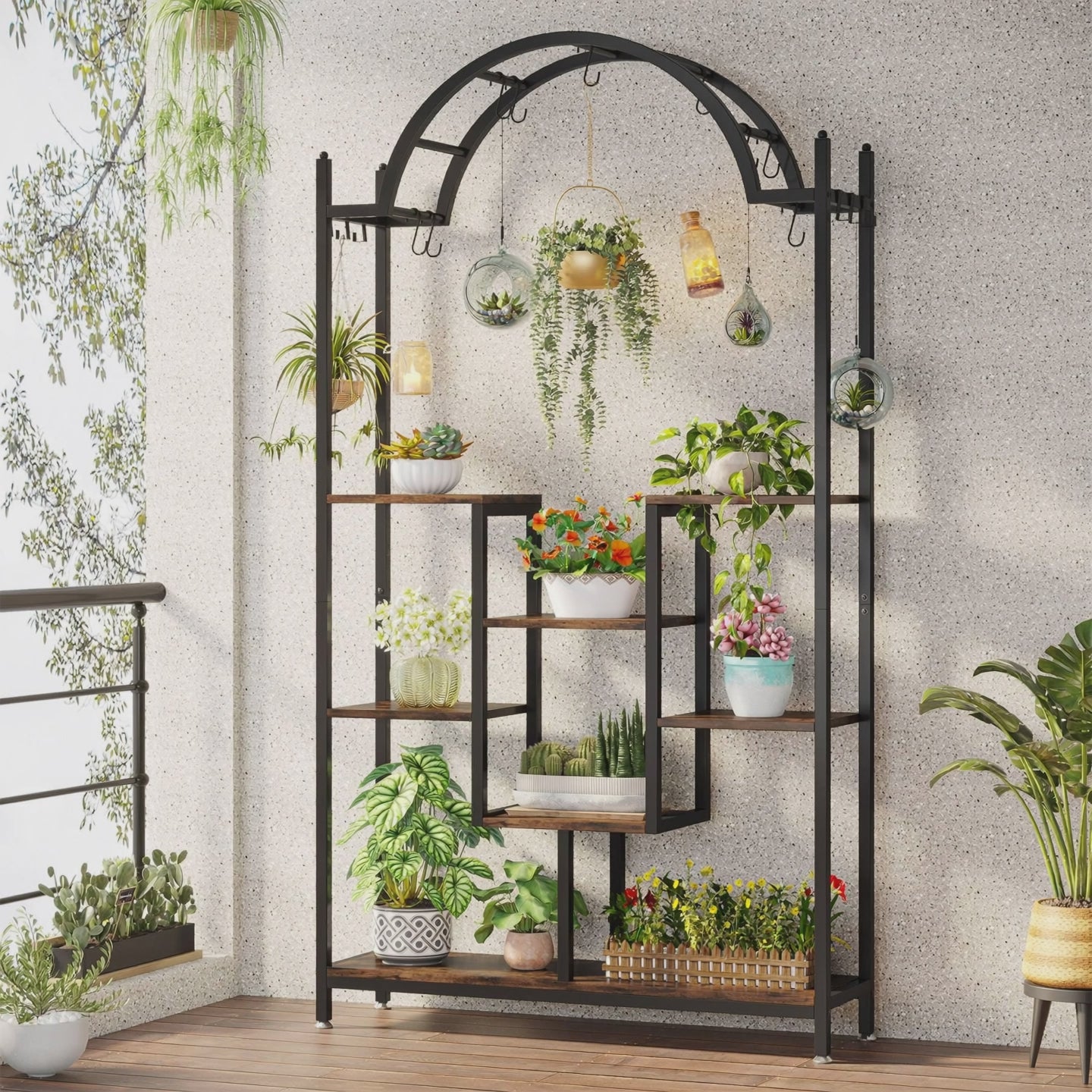 Ahorro de Espacio y Gran Capacidad – El diseño vertical y arqueado aprovecha eficientemente esquinas y espacios reducidos. Puede albergar al menos 8 macetas, siendo perfecto para living, comedor, balcón, terraza o jardín.